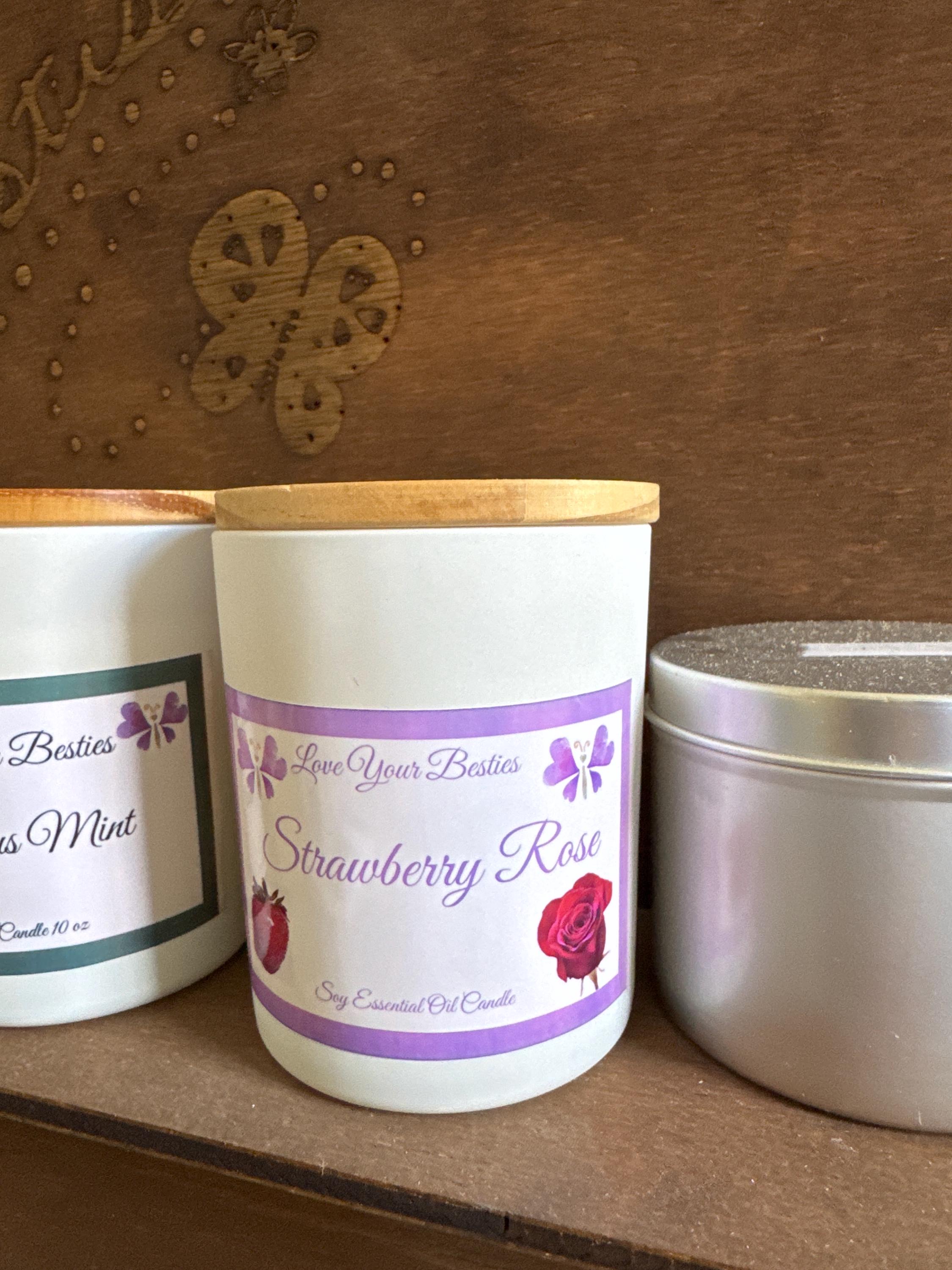 Eucalyptus Mint or Strawberry Rose Soy Candle: Aromatherapy Essential Oil Candle with Dried Flowers